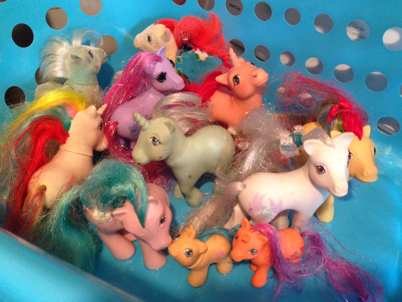 I’m not counting the Transformer that we bought for Goofball last month on his birthday. The kids don’t receive any presents from us at the party. We don’t feel the need to show off in front of friends and family by presenting the birthday child with a big, expensive gift. I do have a tradition involving personalized birthday shirts. I make something special with their name and age on it. This year, I found clearance shirts, bought some My Little Pony fabric, and used puffy paint from my craft supplies. I will mention the gift that Tornado received from us on her actual birthday, my collection of ponies. She is three years old, the toys are brand new to her. Tornado was ecstatic to receive so many ponies. I recommend taking a look through your old things for toys to share instead of buying new ones – sentimental recycling at its best!
